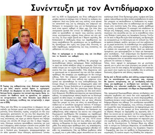 Πρόκειται για ένα δήμαρχο αχυράνθρωπο, ένα ανδρείκελο που άγεται, φέρεται και ελέγχεται από τον γνωστό αρχιευνούχο του, ο οποίος, αφού ρήμαξε την Κερατέα τώρα επεκτάθηκε και στο Λαύριο. Το σιχαμερό εκείνο υποκείμενο δεν τόλμησε να κατέβει στις εκλογές αλλά ανέλαβε την σημαντικότερη θέση στο δήμο Λαυρεωτικής και επί της ουσίας αντικαθιστά τον δήμαρχο αφού εκείνος το μόνο για το οποίο αρέσκεται είναι οι γυροβολιές στα τοπικά μεζεδοπωλεία και καφενεία πίνοντας ουζάκια και χαζολογώντας σαν μαθητούδι που την έκανε κοπάνα από το μάθημα. Είναι ντροπή να πεινάει τόσος κόσμος και αυτό το αναίσθητο ανδρείκελο να αδιαφορεί. Είναι ανίκανος να συντάξει μια πρόταση για αυτό είναι απόλυτα εξαρτημένος από το πλέον ύπουλο αρπακτικό που γνώρισε η Λαυρεωτική.